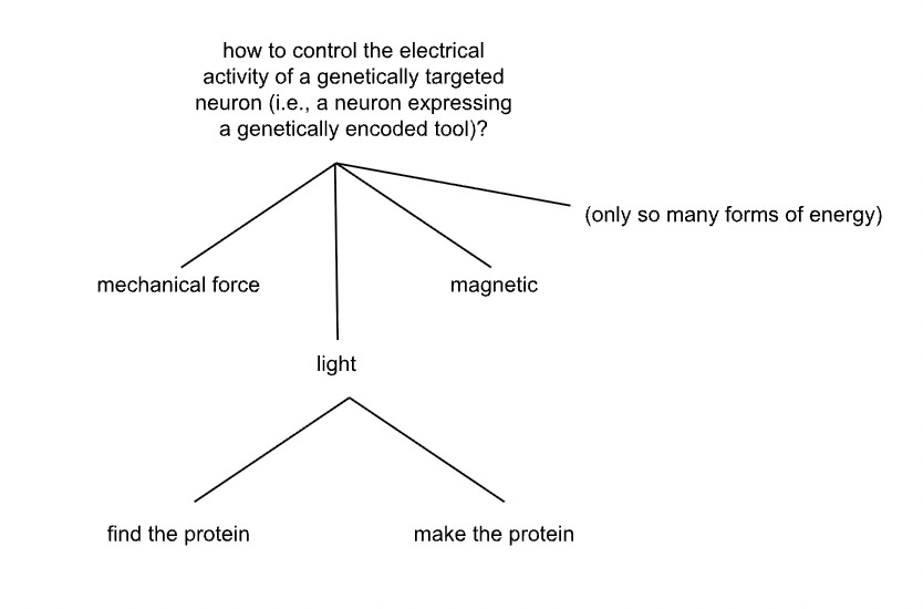 It can be useful to redo a tree every now and then: perhaps an idea that was bad last year, is now a good idea, because of some change in the world (e.g., AI tools are now available, or genome sequencing is now cheaper, or computers are faster, or some other trend). The tree that yielded optogenetics is such an example: in the years since we did the original thinking, people have characterized many new force-sensitive, magnetic field-sensitive, and other proteins, and therefore some branches of the tree are now more impactful and/or feasible than they appeared to be, in the year 2000. New technologies are emerging, such as sonogenetics and magnetogenetics, which seek to activate neurons expressing mechanical force- and magnetic field-sensitive proteins, respectively. Regarding finding vs. making the protein - in this era of generative AI, perhaps novel protein architectures could exhibit features not achievable with purely natural proteins.