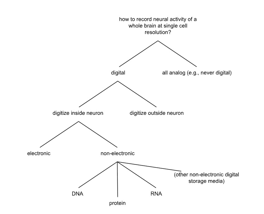 It is worth noting that when we originally looked at non-electronic digitizing-in-neuron strategies, we heavily explored DNA- and RNA-based methods. However, the world changed, and advances in protein engineering eventually made a protein-based approach, in which proteins self-assemble into a ticker-tape-like chain to encode the timing of recorded neural events, quite promising. Maintaining a tiling tree and revisiting it periodically as synergistic fields advance, can help reveal when tree branches that might have previously seemed like dead ends, might be ready to yield fruit. If a branch seems especially worthy for some reason, but is blocked by a missing capability, it may be worth revisiting, especially when technologies relevant to that missing capability are rapidly changing. Or perhaps going after that missing capability, through inventive work, would be a worthy project in its own right.