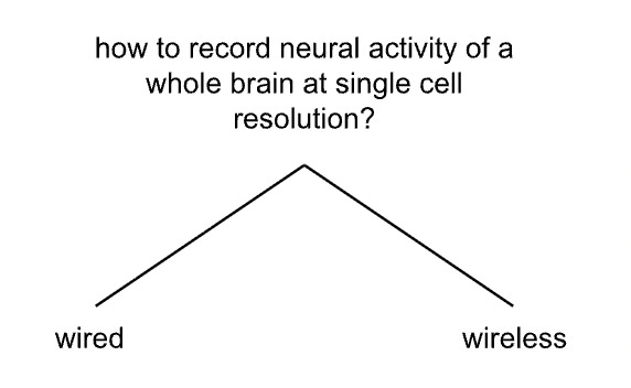 How can we record the high speed electrical activity of neurons in the brain? Because different neurons have different roles, we want to do such recording scalably - recording as many neurons as possible. Perhaps we want to aim for recording the activity of neurons throughout the whole brain, at single cell resolution. This might be especially useful if we want to understand how the brain computes (there is evidence that a single neuron can influence the activity of the entire brain12), although for brain-machine interfaces, such a goal might be less critical - you might be able to control a computer with a tiny fraction of the information of the entire brain. Whole brain neural recording is a very ambitious goal. A first split might be to consider whether the neural data is relayed out of the brain through wires (physical conduits for information-carrying particles or energy to be conveyed), or through wireless (information-carrying particles or energy are conveyed through free space) means: