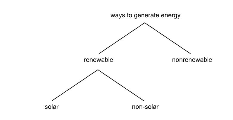 We first split the entire set into renewable and nonrenewable subsets. The renewable subset, in turn, we split into solar and non–solar subsets. What is a renewable, non-solar method of generating energy? Suddenly, we are in a regime of ideas that most of us, perhaps, do not think about every day. Maybe ocean tides could move masses in harbors near a city, driving downstream electricity production. Geothermal energy comes to mind - could there be versions of that, that could be implemented anywhere on earth? The tree is forcing us to think about ideas that we may not have been thinking about before. (As an exercise, you might try to continue extending the tree above.)