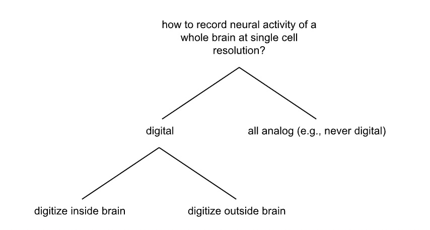 Can we try a radically different split, for the neural recording example? Brain data must eventually be in digital form, if we are to analyze it in an implanted microchip, or an external computer, or some other digital device. Do we digitize neural data in the brain, and relay out just the bits, or do we digitize the data outside the brain, after relaying out analog info?