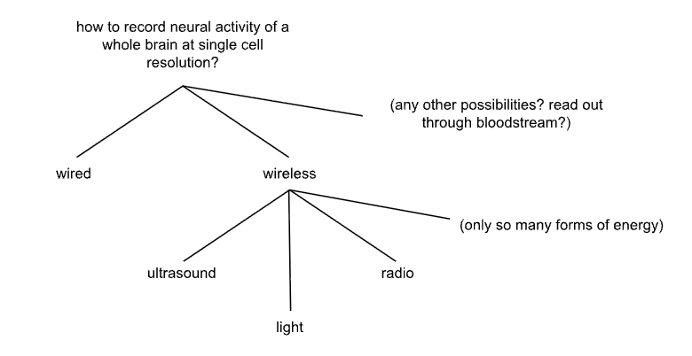 Really stretching oneself to think - did I really tile the space? - is useful. As an exercise - let’s go back to the wired vs. wireless neural recording example. Is there a third alternative to wired and wireless? Defined as above, there are definitely options not covered by the categories we were calling wired and wireless (as you may recall, we were defining wired as relying on “physical conduits for information-carrying particles or energy to be conveyed,” and wireless as “information-carrying particles or energy are conveyed through free space”) - for example, what if we don’t rely on particles or energy at all? Hmm… what about secreting information out of the brain, in chemical form, through the bloodstream, where it can be easily harvested through a simple blood draw?