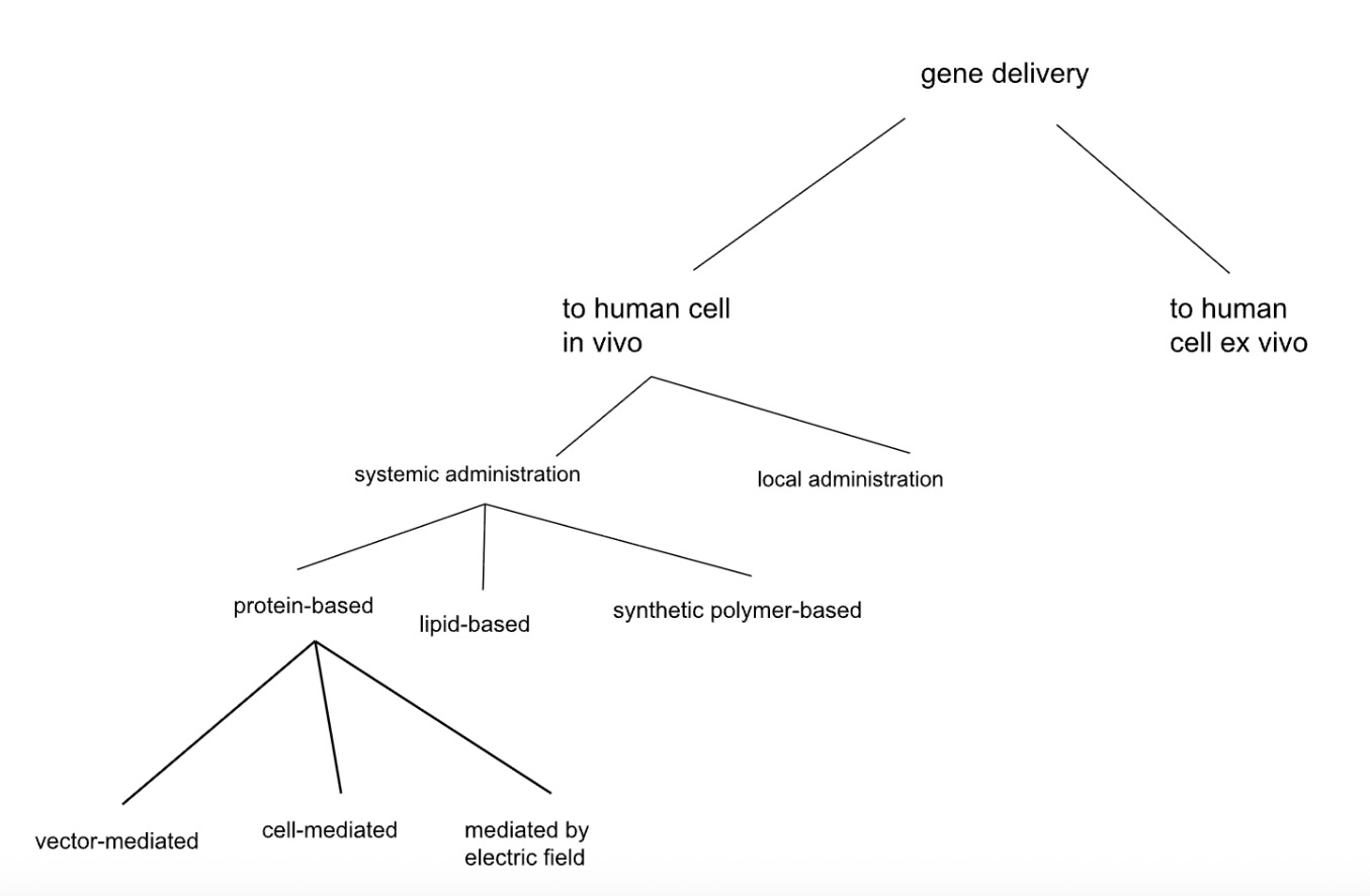 A viral vector carrying a payload might fit the colloquial definition of vector-mediated. But the vector still has to interact with the cell membrane. Would that interaction count as cell-mediated? The three categories below “protein-based” are of different kinds (vector = payload carrier, cell = therapy recipient, field = physical mechanism) rather than being of the same kind (e.g., different types of protein-based carrier, or different ways of delivering a protein-based carrier). If we split “protein-based” (with the caveat, above, of its definitional ambiguity) into subsets of the same kind, then we reduce the risk of overlap. We are splitting along one consistent dimension.