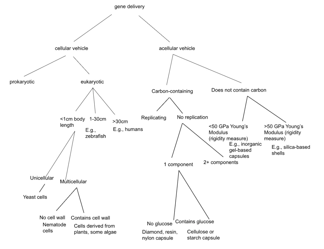 For acellular paths: “carbon-containing,” followed by “no replication”, followed by “1 component” raises the question - what single-component materials can encapsulate genes? If glucose-containing: perhaps cellulose or starch capsules. These are biocompatible, biodegradable, cheap, and can be chemically modified. On the carbonless branch, we split by a quantitative measure of material rigidity (Young’s modulus), another example of a strict and well-defined split.