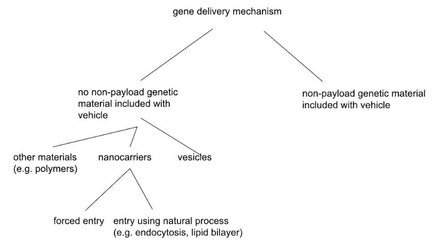 Additionally, look at the “protein-based” branch, which splits into “vector-mediated”, “cell-mediated”, and “field-assisted.” What do “mediated” and “assisted” actually mean, physically? And could something be both vector-mediated and field-assisted (e.g., an electric field could in principle get a virus across a barrier)? There is a bit of a category error here - the different subsets are of qualitatively different kinds. It’s like classifying vegetables as red, sweet, and crunchy - since the categories are along different dimensions, they inherently incur overlap.